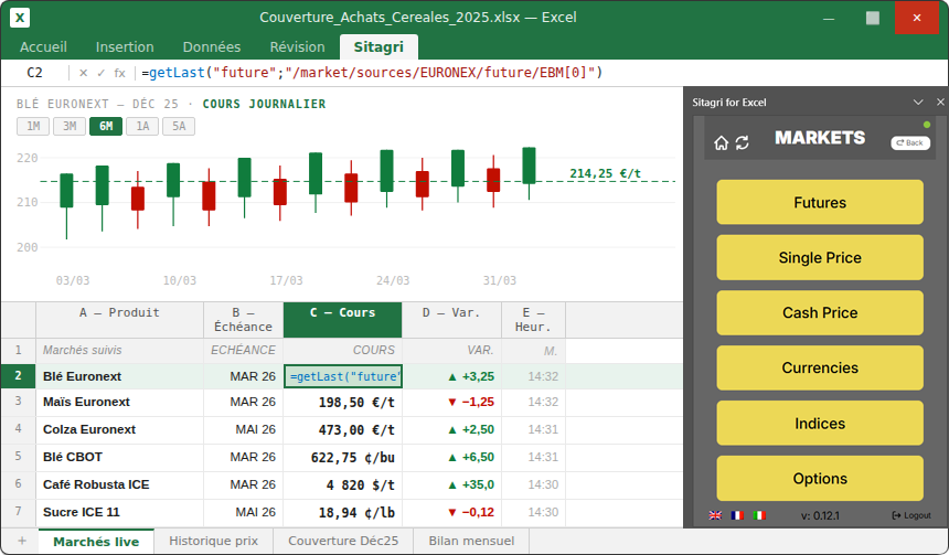 Importez en temps réel les cours Euronext, CBOT, ICE et les prix cash directement dans vos feuilles de calcul. Prenez de meilleures décisions, sans quitter Excel.