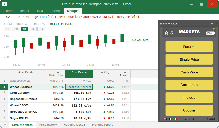 Import real-time Euronext, CBOT, and ICE prices along with cash prices directly into your spreadsheets. Make better decisions without leaving Excel.